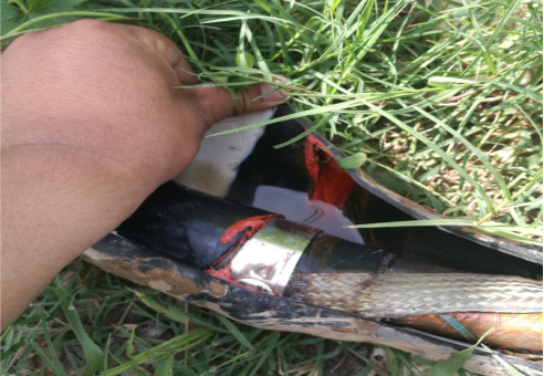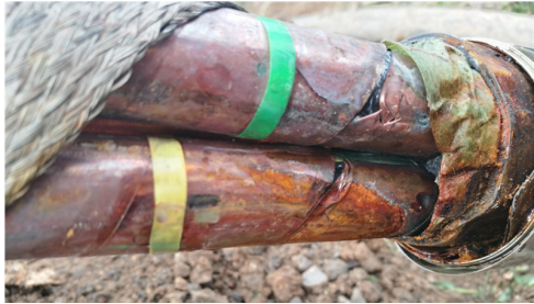 周期放電去聲磁定位,剛開始還能聽到聲音,在精確定位時發(fā)現(xiàn)聽不到聲音了,判斷為故障點燒穿,成為低阻故障,所以聲音減小,現(xiàn)場人員告知此處有一接頭,停止放電挖出接頭后發(fā)現(xiàn)接頭外觀完好,反復(fù)搖晃電纜接頭,繼續(xù)打壓,在接頭處聽到微弱放電聲,打開接頭后發(fā)現(xiàn)接頭進水。