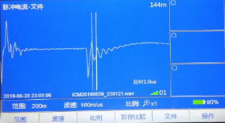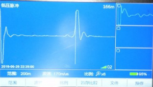 根據(jù)測試情況選擇黃地打壓,升高電壓至20KV時擊穿放電,用脈沖電流測得故障位置在144米左右。距離對端比較近。