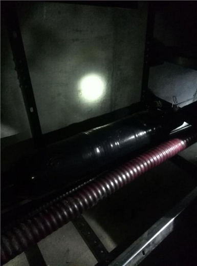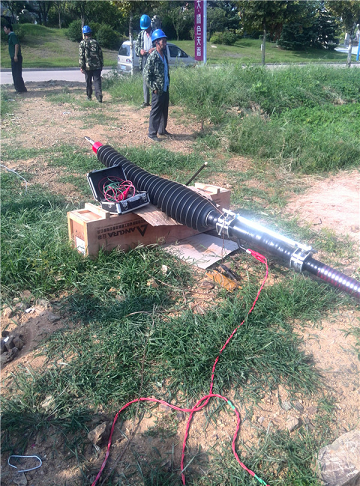 經(jīng)過測距設(shè)備檢測故障位置距離測試端30米。設(shè)備再次加壓,在故障位置明顯看到有燃弧現(xiàn)象,定位完畢。